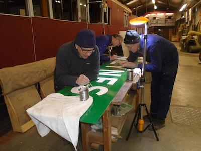 Carriage & Wagon Department volunteers (L to R) Robin Steadman, Roger Jordan and Martyn Longstaff are seen working with care to restore the “Running-in Board” for platform 2. The main structure had been completed whilst the sun was shining, and the sign writing is being sorted in the dry workshop.