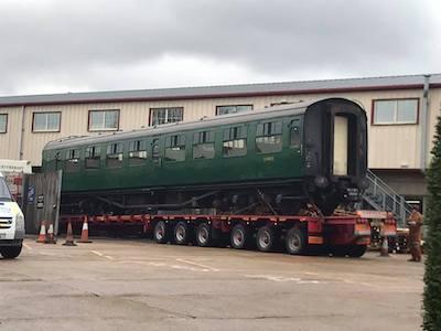 The Bulleid coaches being loaned by the Bluebell Railway to the Mid Hants Railway for their Flying Scotsman event left by road at the end oflast week after a change of transport plan.